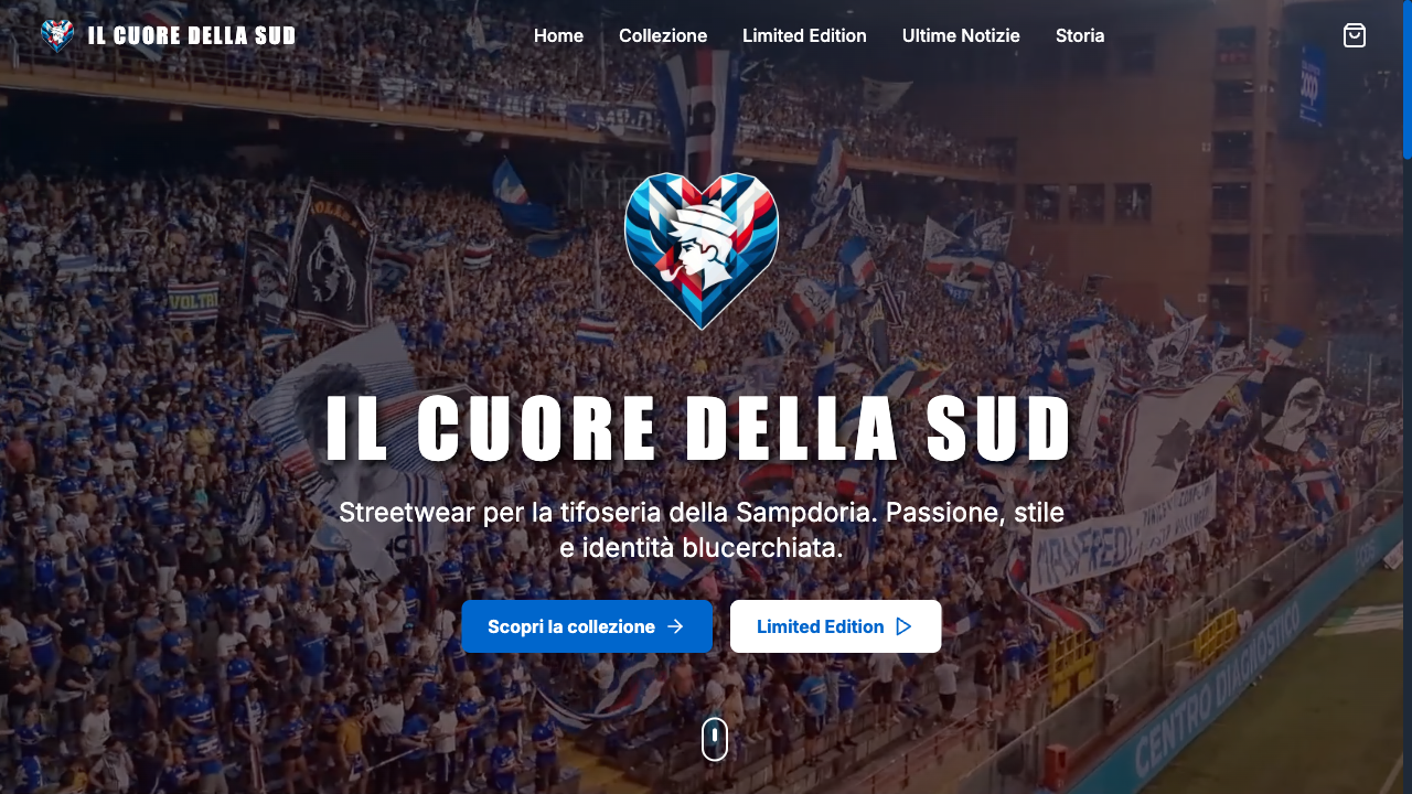 E-commerce full-custom con: catalogo prodotti con filtri, edizioni speciali con countdown timer, integrazione Stripe per pagamenti sicuri, codici sconto, ticker animato per FOMO sui lanci, gestione ordini e spedizioni, design che rispecchia l’identità blucerchiata del brand.